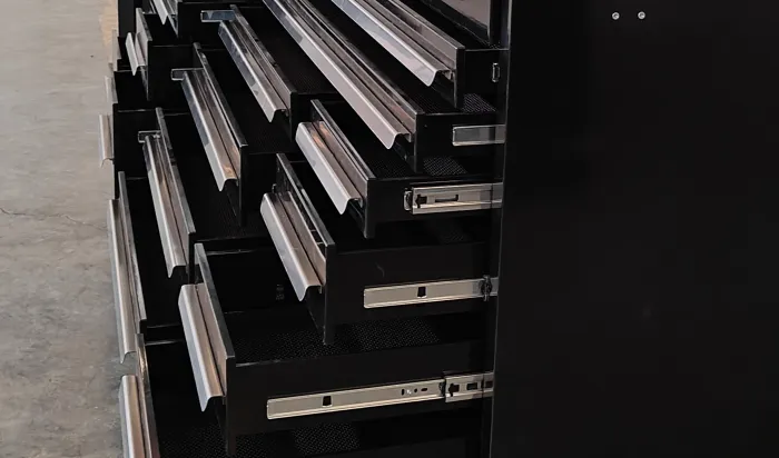 Σιωπηλές ράγες διαφανειών: Το μαύρο πολυλειτουργικό ντουλάπι εργαλείων έχει βαριές σιωπηλές ράγες, με ομαλή δράση έλξης και ισχυρή χωρητικότητα που φέρει φορτίο.