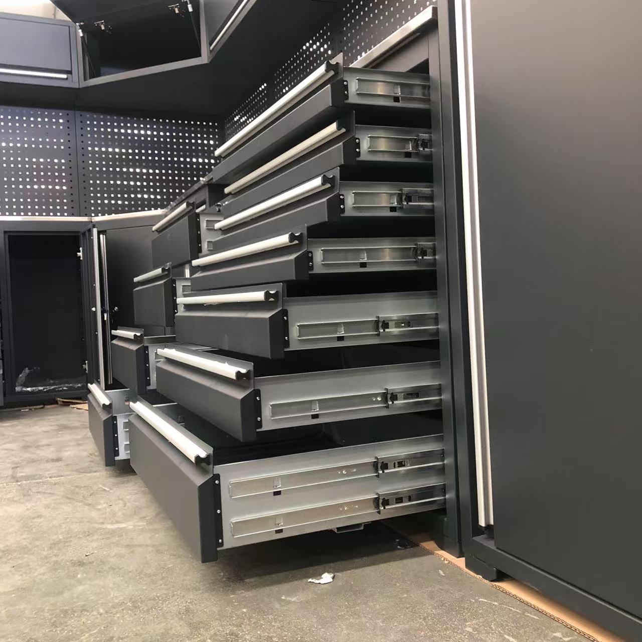 Το πολυλειτουργικό βαρύ εργαλείο εργασίας είναι κατασκευασμένο από ψυχρή πλάκα χαλύβδινης πλάκας με αντιαρματική επικάλυψη στην επιφάνεια, η οποία είναι ανθεκτική στη διάβρωση και ανθεκτική στη φθορά και μπορεί να προσαρμοστεί σε υψηλή υγρασία ή βιομηχανικά περιβάλλοντα. Το πολυλειτουργικό βαρύ εργαλείο Workbench παρέχει πολλαπλό στρώμα διαβαθμισμένο χώρο αποθήκευσης, υποστηρίζει τη διαχείριση των εργαλείων, αξεσουάρ και μικρού εξοπλισμού και βελτιώνει την αποδοτικότητα της εργασίας. Τα πολυλειτουργικά βαριά εργαλεία εργασίας Ench συρτάρια είναι εξοπλισμένα με σιωπηλές ράγες πλήρους επέκτασης, οι οποίες υποστηρίζουν ομαλό άνοιγμα και κλείσιμο όταν φορτωθούν πλήρως, βελτιώνοντας την εμπειρία λειτουργίας.