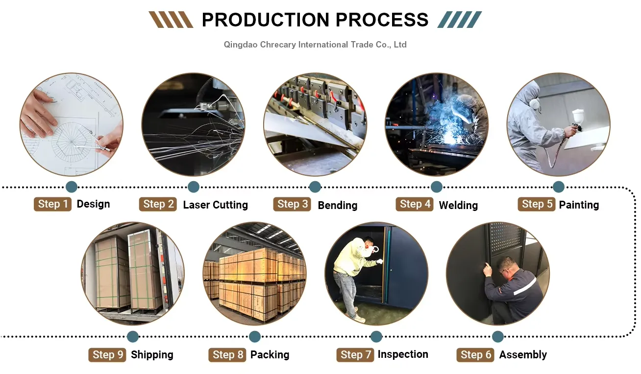 1. Προμήθεια πρώτων υλών: Υψηλής ποιότητας πλάκες από ψυγείο χάλυβα επιλέγονται προσεκτικά ως το κύριο υλικό για να εξασφαλιστεί ότι η αντοχή και η ανθεκτικότητα του υλικού πληρούν τα υψηλά πρότυπα. Ταυτόχρονα, αγοράζονται διάφορα βοηθητικά υλικά υψηλής ποιότητας, όπως διαφάνειες ρουλεμάν για συρτάρια, κλειδαριές και τροχούς.